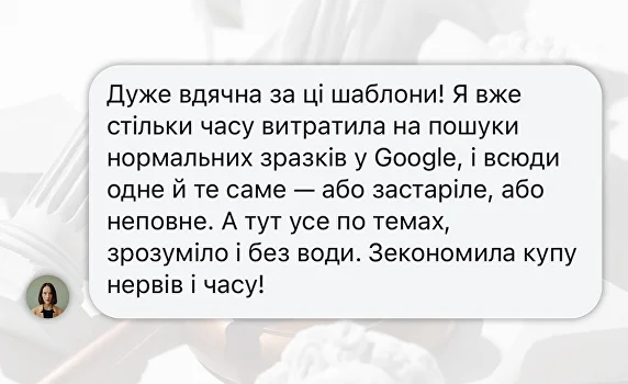 Втомились шукати зразки в інтернеті? Отримайте шаблони, які виграли не один суд. Більше ніяких сумнівів у формулюваннях — завантажили, відредагували під справу й подали до суду.